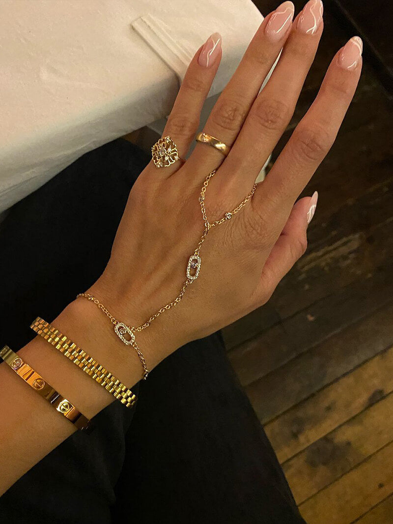 Nossa exquisita corrente de mão Melissa em ouro amarelo ou prata e diamantes é caracterizada por um diamante brilhante em corte movente. O design filigrana com um elegante tratamento pavé enfatiza o brilho dos diamantes.
