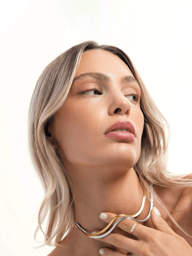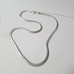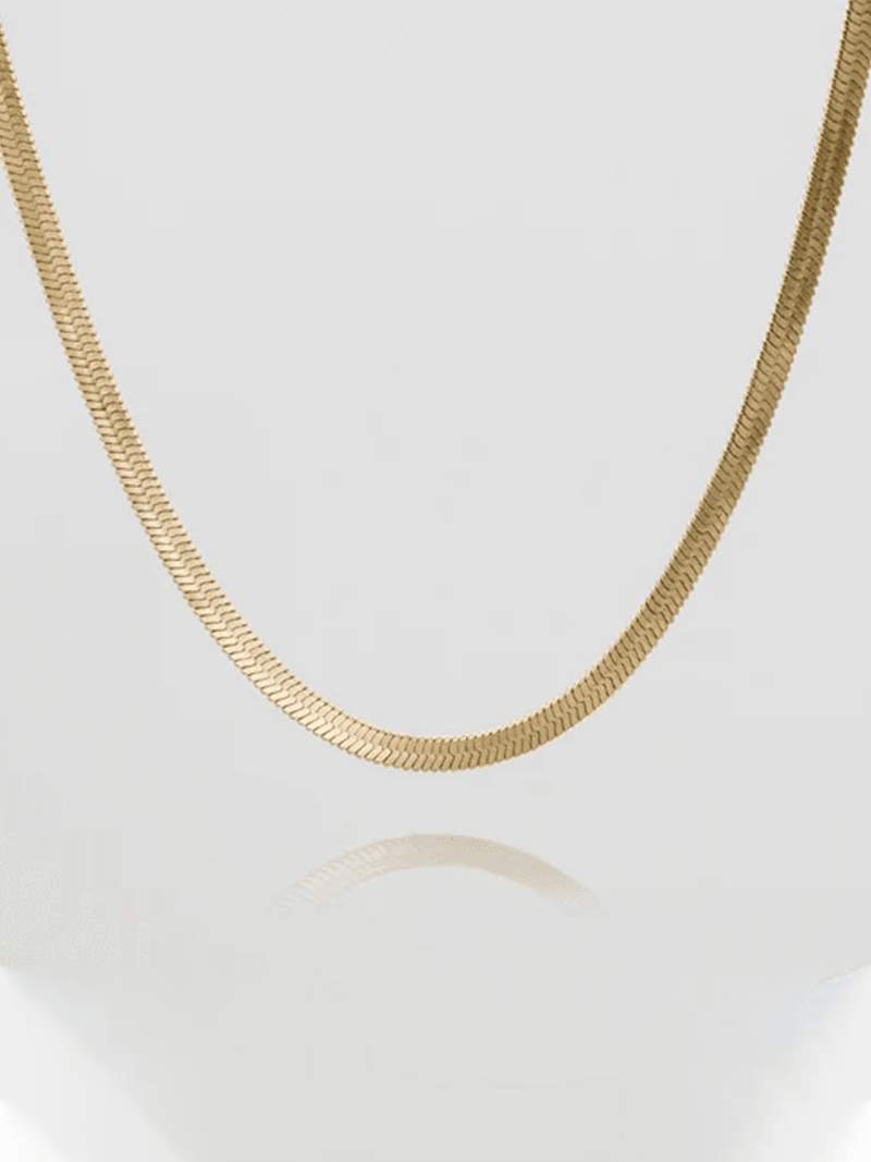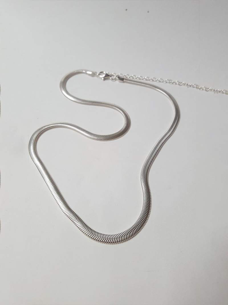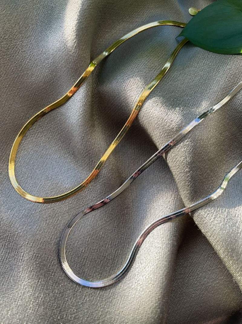 A nossa corrente elegante em ouro destaca-se pelo seu design de corrente de cobra plana e elegante, que incorpora uma mistura de sofisticação e um toque de extravagância. Esta peça impressionante apresenta um detalhamento fino em forma de cobra, simbolizando transformação e elegância. Perfeita para fazer uma declaração ousada, adiciona um toque de mistério e sofisticação a qualquer conjunto.