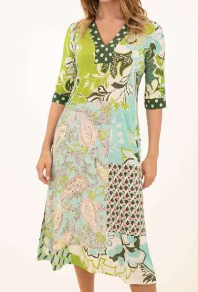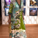 O decote em V afina a silhueta, a fenda subtil adiciona um toque de sensualidade e a estampa vintage garante destaque absoluto — tudo isso num corte leve e fluido que acompanha os seus movimentos com charme.