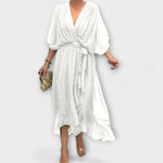 As mangas levemente transparentes e a barra assimétrica dão um toque lúdico, enquanto o cinto laço acentua a cintura e proporciona um caimento favorecedor. Ideal para ocasiões festivas ou momentos especiais do dia a dia – o vestido Amoura promete uma aparência confiante e estilosa.