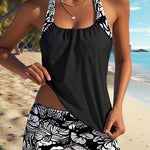 Este conjunto de tankini combina conforto e estilo com um top solto e sem mangas, que suavemente esconde a barriga e a cintura. O tecido elástico e de secagem rápida move-se contigo, e os calções oferecem liberdade de movimento ideal. O clássico padrão floral em preto e branco cria um look elegante, perfeito para mulheres que desejam sentir-se confortáveis e femininas.