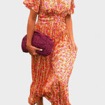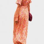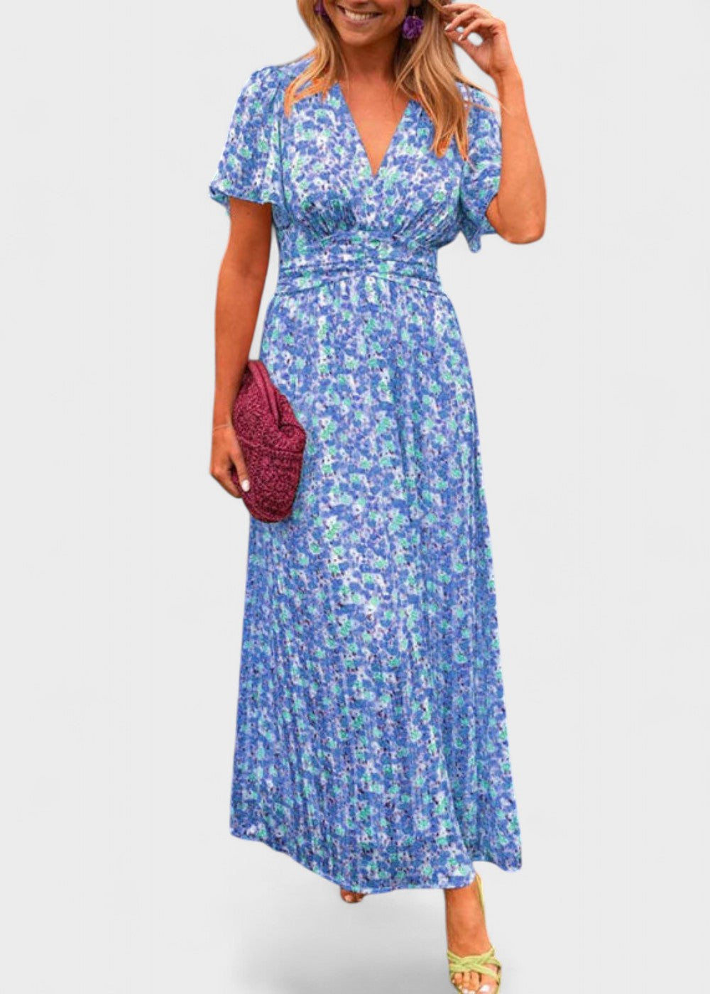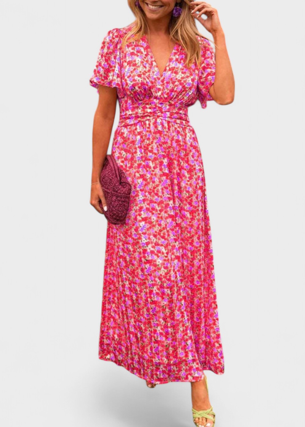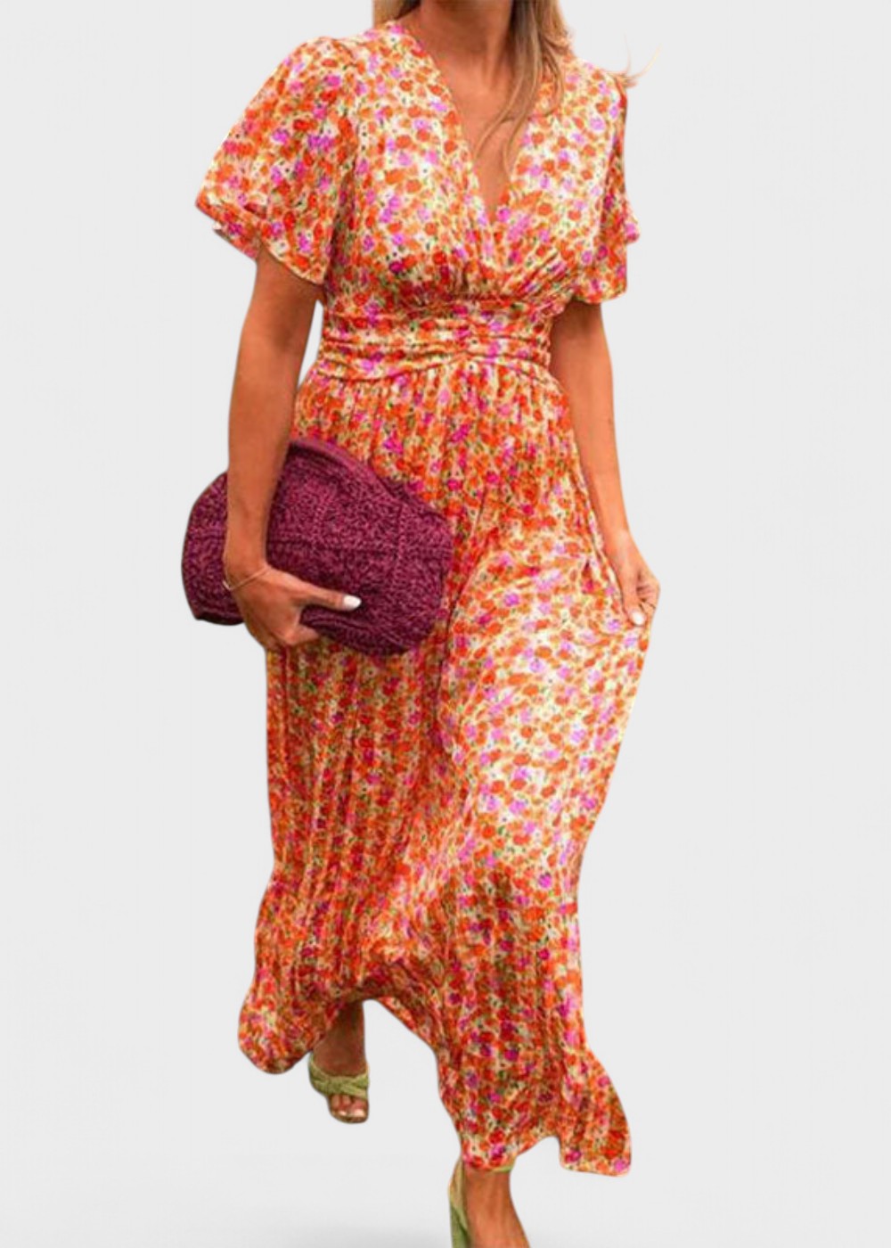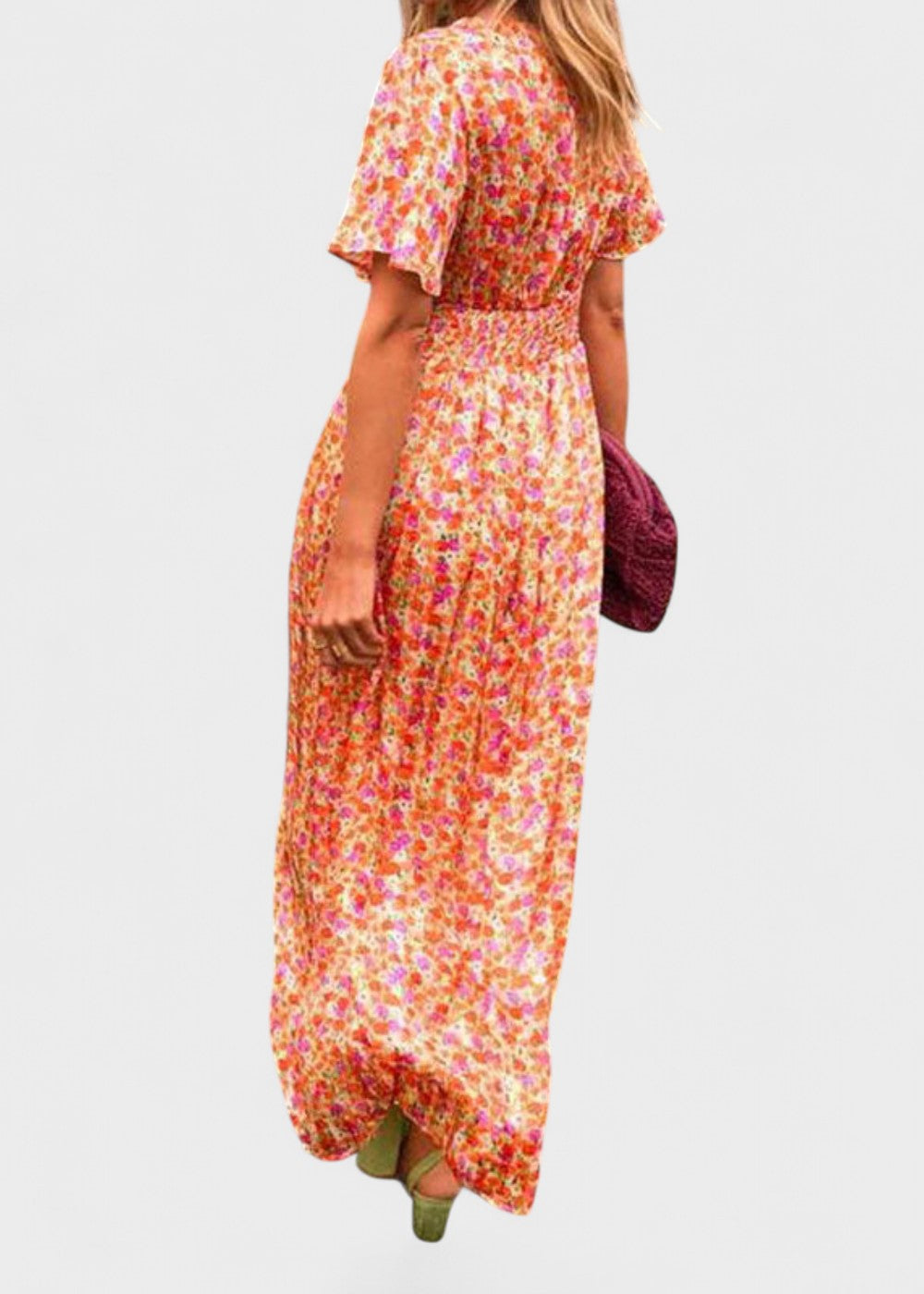 O vestido maxi floral Bianca com mangas esvoaçantes é um must-have absoluto para dias de sol no jardim, no mercado ou em encontros acolhedores com amigos. O padrão floral vibrante em cores frescas e o decote em V feminino proporcionam-lhe um visual encantador com charme natural.