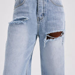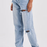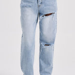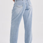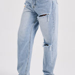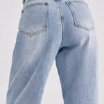 Descubra a perfeição do denim com a calça Tropez, feita em um tecido de lavagem azul com um corte oversized e uma cintura mais baixa. Combine-a com um mini que realça a cintura.