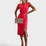 O vestido é a definição de vestuário poderoso. Com o seu corte justo, a elegante fenda nas pernas e as linhas simples e sem mangas, centra-se na elegância minimalista com o máximo impacto - perfeito para negócios, eventos ou noites exclusivas.