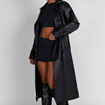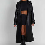 Apresentamos nossa luxuosa roupa externa para complementar todos os looks. Feito de nosso suave e flexível couro sintético premium, este design de duplo botão possui um cinto que acintura e cai em um comprimento midi ultra chique. Esta peça clássica de sobreposição funciona muito bem na transição entre as estações. Use a sua jogada sobre o seu conjunto favorito para arrasar nas vibrações de garota descolada.