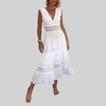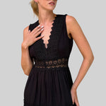 Este vestido preto sem mangas destaca-se pelo seu delicado trabalho de renda no decote em V profundo e na cintura, criando uma silhueta feminina e sofisticada.