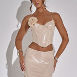Junte-se à Elite com o Larisa, um corset de lantejoulas cintilantes que possui busto com copas, design de comprimento mais longo e detalhe de corsage de rosa em lantejoulas. O visual é finalizado com um impressionante recorte nas costas com fechamento por amarração.