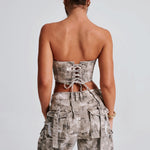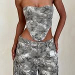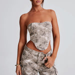 Estamos apaixonados por corsets! Apresentando a peça IT da nova temporada, o top corset Yasie, inspirado na estética incrível dos anos 00. Com estilo sem alças e um ajuste super justo, é feito em nosso tecido com estampa camo que fica incrível combinado com as calças Brooklyn.