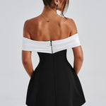 Este estilo tão romântico, mas moderno, está no topo da nossa lista de desejos. Faça uma declaração com o Delta, projetado com um decote bardot em contraste que destaca seus ombros, e adornado com um detalhe de laço sonhador nas costas. Em um comprimento mini divertido, o look é completado com uma saia arredondada em forma de bolha.