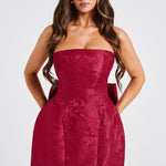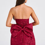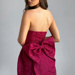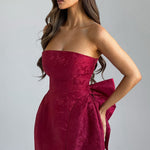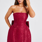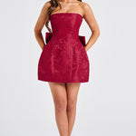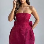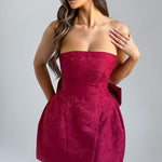 O vestido da temporada chegou e você vai ficar obcecada. Conheça Elenora, nossa mini dos sonhos com uma saia estruturada e um corpete que afina a cintura. Este modelo sem alças é completo com amarração nas costas e um laço oversized para um drama feminino perfeito.
