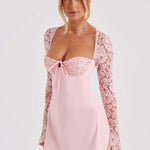 Sonhando com detalhes delicados e sutis? Conheça Jacinta, seu novo vestido mini favorito feito em renda floral elástica de luxo, com mangas longas e flare, busto com copas e detalhe de laço. Este design inspirado nas leiteiras será seu favorito durante toda a temporada, seja combinado com botas até o joelho para um brunch sem fundo ou com plataformas altas para sua próxima noite de encontro.