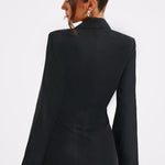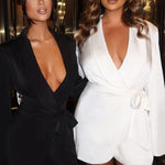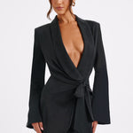 Diga olá ao vestido blazer dos seus sonhos. Este mini é cortado de um tecido tecido premium que é levemente ajustado, com mangas longas e flutuantes e detalhe de lapela. Este design chique é finalizado com uma faixa de laço oversized na frente.