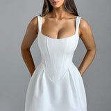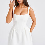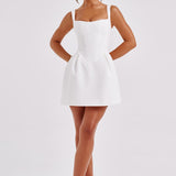 Janiyah é O vestido para a temporada de festas com a silhueta mais bonita. Este mini é cortado de um tecido tecido premium e estruturado com um corpo corset que ajusta a cintura e desce em um formato de V baixo. O visual é completado com uma saia volumosa icônica.