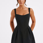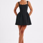 Janiyah é O vestido para a temporada de festas com a silhueta mais bonita. Este mini é feito de um tecido tecido premium e estruturado com um corpo corset que afina a cintura e desce em um formato de V baixo. O look é completado com uma saia volumosa icônica.