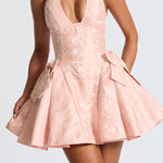 Prepare-se para chamar a atenção com o Vestido Mini Jocelyn em Pêssego Suave! Apresentando um decote profundo e halter, e um tecido jacquard floral estruturado para um caimento lisonjeiro. A parte de trás com amarração e os copos com aro adicionam um toque ousado, enquanto a saia cheia e os painéis godet plissados nos quadris criam uma silhueta divertida. Além de dois pares de laços destacáveis, pequenos e grandes, para personalizar seu visual.