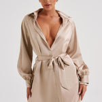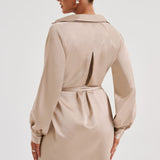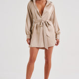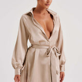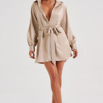Perfeito para transitar do dia para a noite, o vestido mini Kara apresenta um cinto amarrado na cintura, mangas longas exageradas e uma barra fluida. Combine o seu com botas de salto até o joelho e cabelo liso.