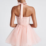 Chame a atenção com o Vestido Mini Keely em Pêssego Suave - uma mistura dos sonhos de elegância e charme. Projetado com um decote coração com aro e copas plissadas, oferece o levantamento e a forma perfeitos. As alças de pescoço halter se amarram graciosamente nas costas, enquanto as costas com amarração ajustam sua cintura para um caimento impecável. Finalizado com uma saia de tule, Keely entrega uma vibe de conto de fadas com um toque flirt.