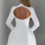 • Costas abertas com recorte em forma de chave e botão na nuca.