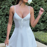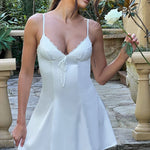 Use o Lainey para todas as suas soirées, encontros de brunch e festas no jardim nesta temporada. Cortado em nosso luxuoso cetim stretch que possui um brilho bonito, este mini vestido fofo tem copas em formato de triângulo com um acabamento em renda e saia em formato A. O look é completado com um delicado laço no centro do busto. Estilize o seu com joias douradas e sapatos mule.