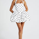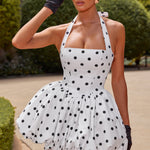O Vestido Mini Maricia na clássica estampa de Poá Preta é uma peça ousada e divertida para qualquer ocasião. Com decote quadrado e alças tipo halter, e uma saia volumosa em formato de puff, ele exala charme vintage com um toque moderno. As costuras princesa realçam a silhueta, enquanto o painel traseiro franzido e o detalhe de amarração garantem um ajuste justo e lisonjeiro.