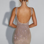 Experimente o máximo em luxo com nosso Vestido Mini Petra em Dourado. O comprimento mini e o tecido de rede elástica criam um ajuste bodycon que valoriza a silhueta, enquanto o decote quadrado e as costas em formato de gota adicionam um toque de elegância. Adornado com strass quadrados hotfix e forrado em malha semi-transparente.