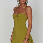 Estamos obcecadas pelo vestido Renee, um mini elevado feito em nosso luxuoso cetim sem elasticidade e delicado chiffon. Com alças de pescoço halter e um bonito busto franzido com copas com aro, o design se ajusta na cintura e se abre suavemente na barra.