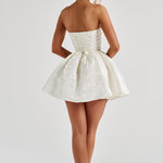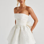 O Vestido Mini Salome em Marfim é a combinação perfeita de elegância e charme, projetado para aquelas ocasiões especiais em que você deseja se destacar. Confeccionado em um lindo tecido jacquard floral, este vestido sem alças apresenta um corpete plissado com estrutura interna para proporcionar uma silhueta ajustada e feminina. A saia ampla adiciona volume, enquanto as costas com amarração garantem um ajuste personalizável. Finalize o look com o laço oversized removível nas costas. Combine com saltos delicados e acessórios para um visual sofisticado.