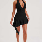 As formas suaves e sexy do Tash fazem dele um item indispensável para o seu guarda-roupa da nova temporada. Feito em um tecido elástico que se ajusta ao corpo e acentua suas curvas, este mini vestido com barra assimétrica apresenta um decote profundo em cowl que emoldura o busto, uma saia leve e com babados, detalhe de flor de corsage e babados caindo de um lado.