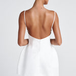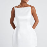 O Vestido Mini Tate em Marfim é uma peça moderna, mas atemporal, que exala charme sofisticado. Feito de cetim estruturado, este vestido apresenta uma saia em forma de bolha que adiciona volume e movimento lúdico. O decote barco alto e largo realça as linhas limpas e arquitetônicas do vestido, enquanto as costas em formato de gota baixa criam um contraste sutil, adicionando um toque de sedução.