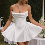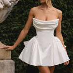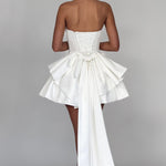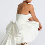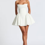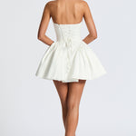 O Vestido Mini Trinity em marfim é a combinação perfeita de elegância e diversão. Seu tecido de cetim stretch e as armações no corpete proporcionam um ajuste lisonjeiro, enquanto a saia cheia e os painéis godê plissados adicionam movimento lúdico. O laço destacável com longas caudas nas costas acrescenta um toque peculiar a este vestido sem alças com decote arredondado e costas com amarração.