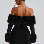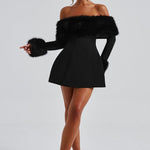 Apresentamos nosso design mais fofo e aconchegante da temporada, Villanelle. Feito com um decote e punhos de pelúcia sintética, o vestido mini tem mangas longas e uma saia em forma de bolha divertida.