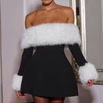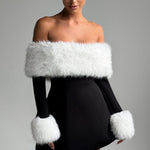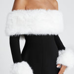 Arrojado, glamouroso e effortless chic, o Vestido Mini Villanelle é uma peça de destaque com um apelo atemporal. Feito de crepe premium sem elasticidade, este vestido apresenta um decote Bardot lisonjeiro e mangas longas, complementado por detalhes luxuosos em pelúcia sintética no decote e nos punhos. A saia em forma de bolha arredondada cria uma silhueta divertida e lisonjeira.