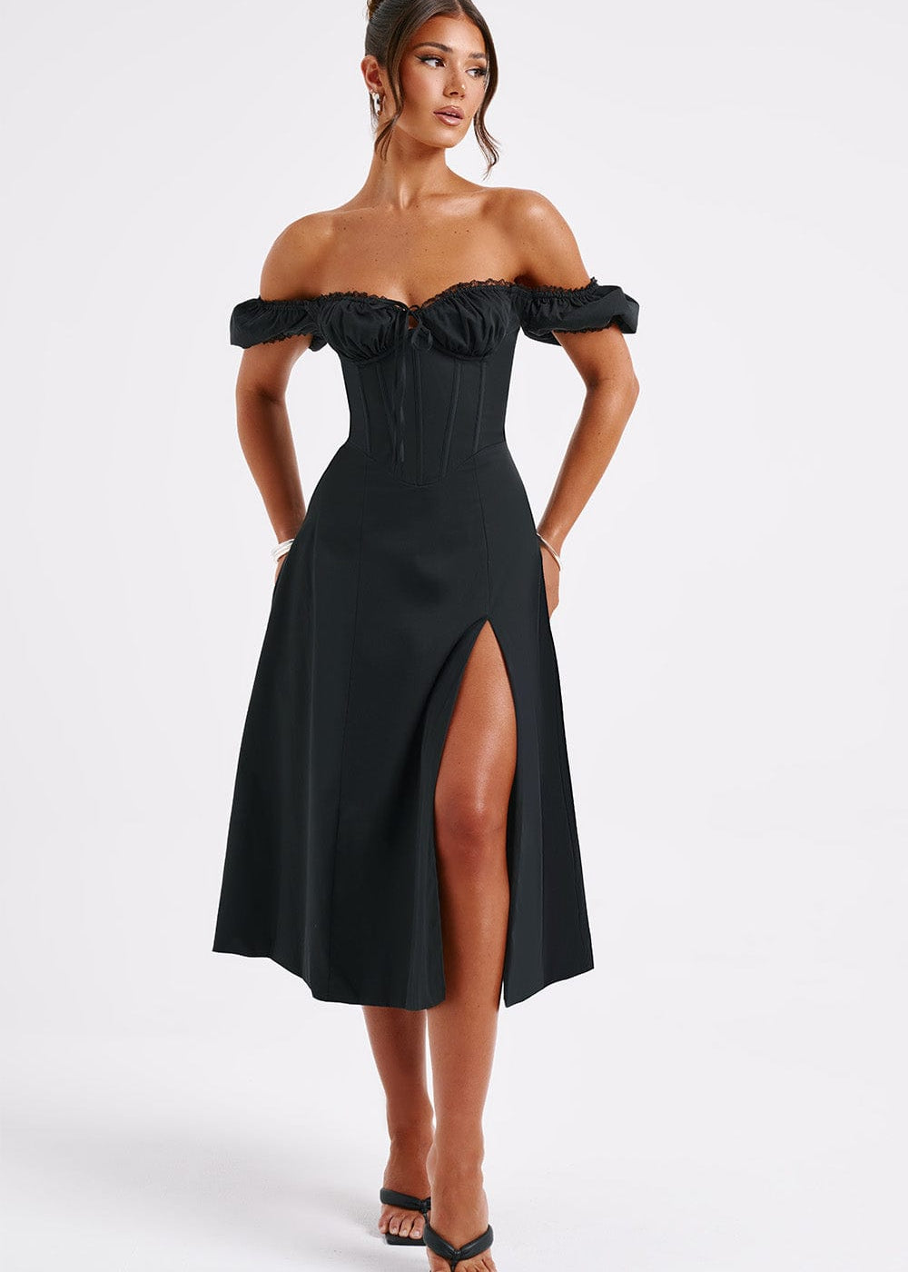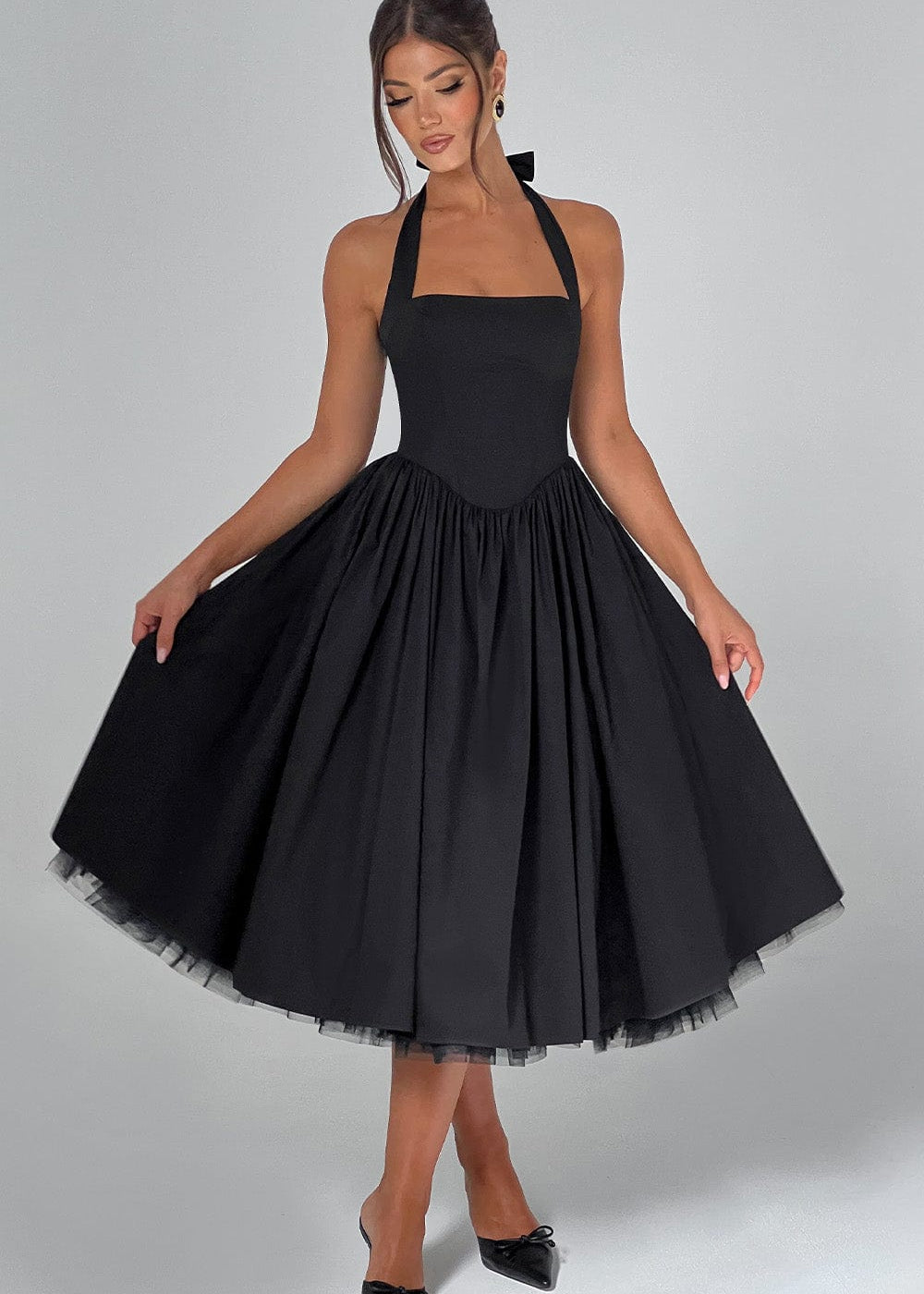 Vestido Midi com Decote em U e Pregas em Preto com Estampa Floral