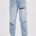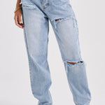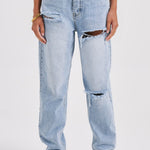 Descubra a perfeição do denim com a calça Tropez, feita em um tecido de lavagem azul com um corte oversized e uma cintura mais baixa. Combine-a com um mini que realça a cintura.