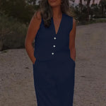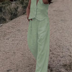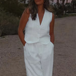 Elegância Atemporal: Este conjunto de duas peças, composto por um colete elegante sem mangas e uma calça ampla, exala sofisticação sem esforço. Seja no brunch durante o dia ou em um evento noturno – graças à sua estética refinada, você sempre parecerá elegante e chique.
