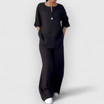 Silhueta Relaxada – Top fluido e calças de perna larga para conforto durante todo o dia.
