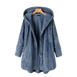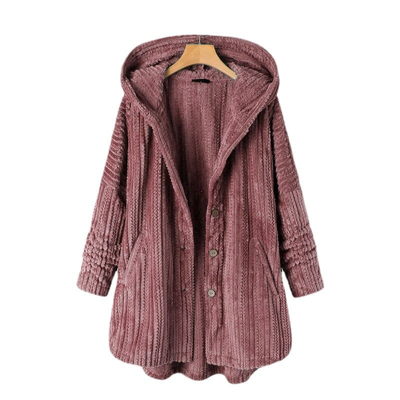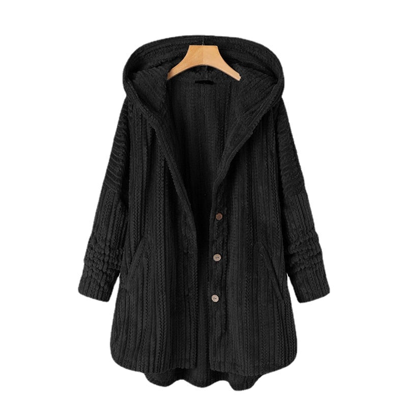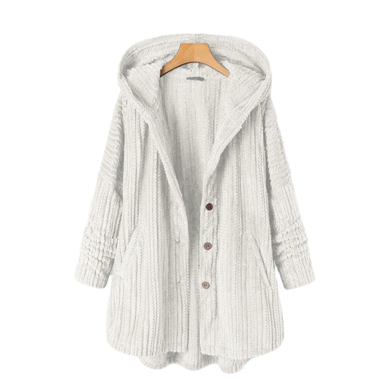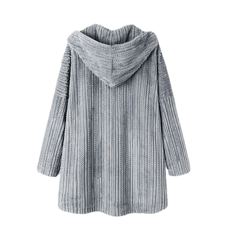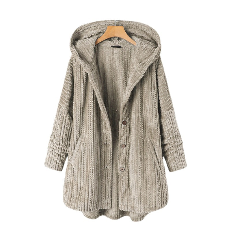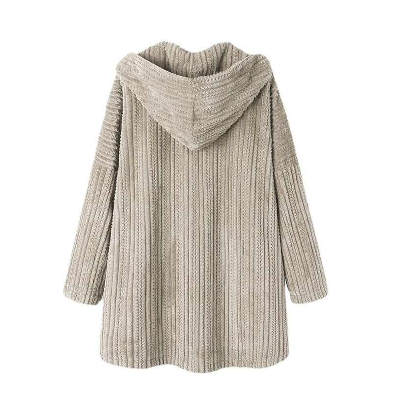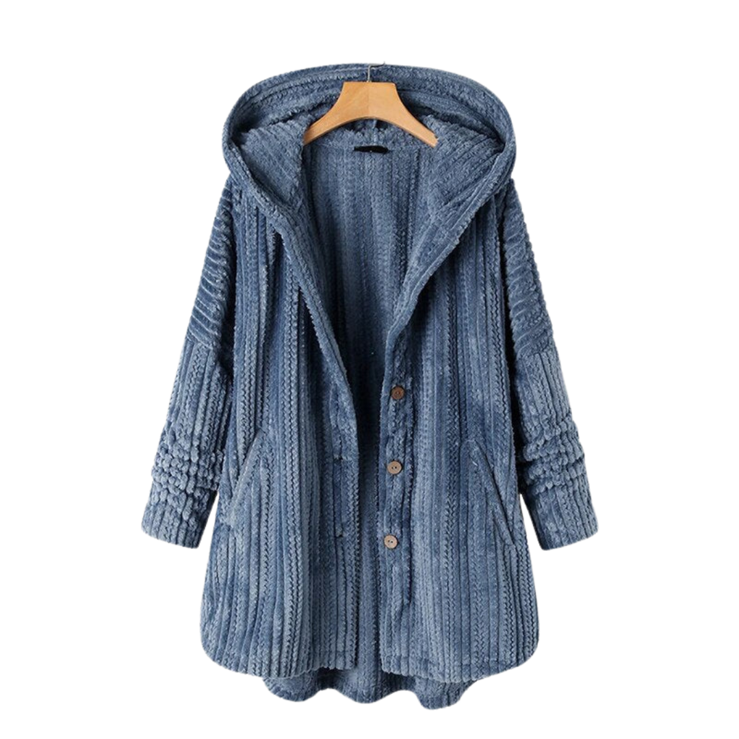 Casaco de lã aconchegante e quente, forrado de lã, com estampa moderna e capuz grande com botão frontal. Mangas compridas com trançado. Comprimento médio até a cintura.