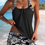Este conjunto de tankini combina conforto e estilo com um top solto e sem mangas, que suavemente esconde a barriga e a cintura. O tecido elástico e de secagem rápida move-se contigo, e os calções oferecem liberdade de movimento ideal. O clássico padrão floral em preto e branco cria um look elegante, perfeito para mulheres que desejam sentir-se confortáveis e femininas.