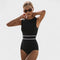 Este fato de banho é a escolha perfeita para quem busca um visual sofisticado, elegante e atemporal. Com decote fechado e linhas contrastantes que definem a cintura, ele combina conforto com um toque de glamour discreto. Ideal para momentos à beira-mar, piscina ou como body em composições urbanas.