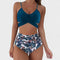 Este biquíni de cintura subida combina elegância e conforto com um toque tropical irresistível. O top azul cruzado valoriza a silhueta e oferece suporte, enquanto a parte inferior com padrão de folhas tropicais proporciona um visual moderno e descontraído, ideal para dias de praia ou piscina com confiança e charme.