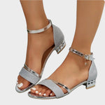 Estas sandálias combinam o glamour do brilho com a sofisticação dos detalhes metálicos dourados. O salto médio e estruturado oferece o equilíbrio perfeito entre estilo e conforto, tornando-as ideais para ocasiões especiais ou para elevar o teu look do dia-a-dia. O fecho com tira no tornozelo garante segurança e um toque feminino irresistível.