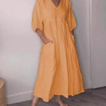 Este vestido midi é a escolha perfeita para quem procura frescura, conforto e um toque de elegância simples. O corte fluido adapta-se ao corpo sem marcar, garantindo movimento e leveza em qualquer ocasião.