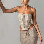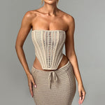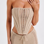 Estamos obcecadas pelo corset Carly, um design fofo de crochê que é perfeito para dias e noites quentes. Este estilo sem alças apresenta aros no corpete para um ajuste perfeito, costas com amarração e barra em formato quadrado. Combine com a Saia Maxi Chayenne para uma combinação feita no céu.