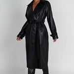 Apresentamos nossa luxuosa roupa externa para complementar todos os looks. Feito de nosso suave e flexível couro sintético premium, este design de duplo botão possui um cinto que acintura e cai em um comprimento midi ultra chique. Esta peça clássica de sobreposição funciona muito bem na transição entre as estações. Use a sua jogada sobre o seu conjunto favorito para arrasar nas vibrações de garota descolada.