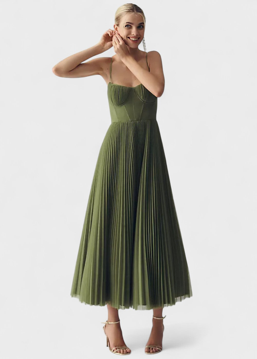 O vestido em tule plissado combina a mais requintada sofisticação com o apelo feminino. Com o seu corpete tipo espartilho, alças finas e saia de tule plissado, é um sonho absoluto para ocasiões especiais como casamentos, galas ou jantares elegantes.