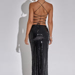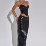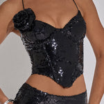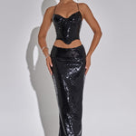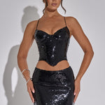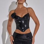 Junte-se à Elite com o Larisa, um corset brilhante de lantejoulas que possui um busto com copas, design de comprimento mais longo e detalhe de corsage de rosa em lantejoulas. O visual é completado com um impressionante decote nas costas com fechamento por laço.