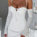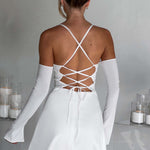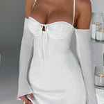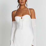 O mini vestido mais sonhador do momento, Fiona é feito de nosso delicado tecido de chiffon que é super leve e bonito. Com mangas longas e bufantes e um estilo off the shoulder, as alças em halter continuam até as costas e cruzam em um detalhe profundo nas costas. O vestido é completo com copas plissadas com aro e um detalhe de laço no busto.