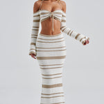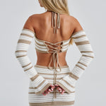 Georgia foi feita para os amantes do sol. Um design premium em crochê com um padrão de listras chique, esta peça icônica é off the shoulder, com mangas longas e flare e um decote coração. Uma alça de pescoço tipo halter pode ser amarrada ao redor do pescoço, enquanto as costas são ajustadas para um ajuste perfeito. Fica incrível quando combinada com a saia de crochê Georgia, sandálias de salto e maquiagem radiante.