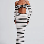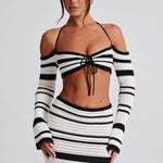 Georgia foi feita para os amantes do sol. Um design premium em crochê com um padrão de listras chique, esta peça icônica é off the shoulder, com mangas longas e flare e um decote coração. Uma alça de pescoço pode ser amarrada ao redor do pescoço, enquanto as costas são ajustadas com cordões para um ajuste perfeito. Fica incrível quando combinada com a saia de crochê Georgia, sandálias de salto e maquiagem radiante.