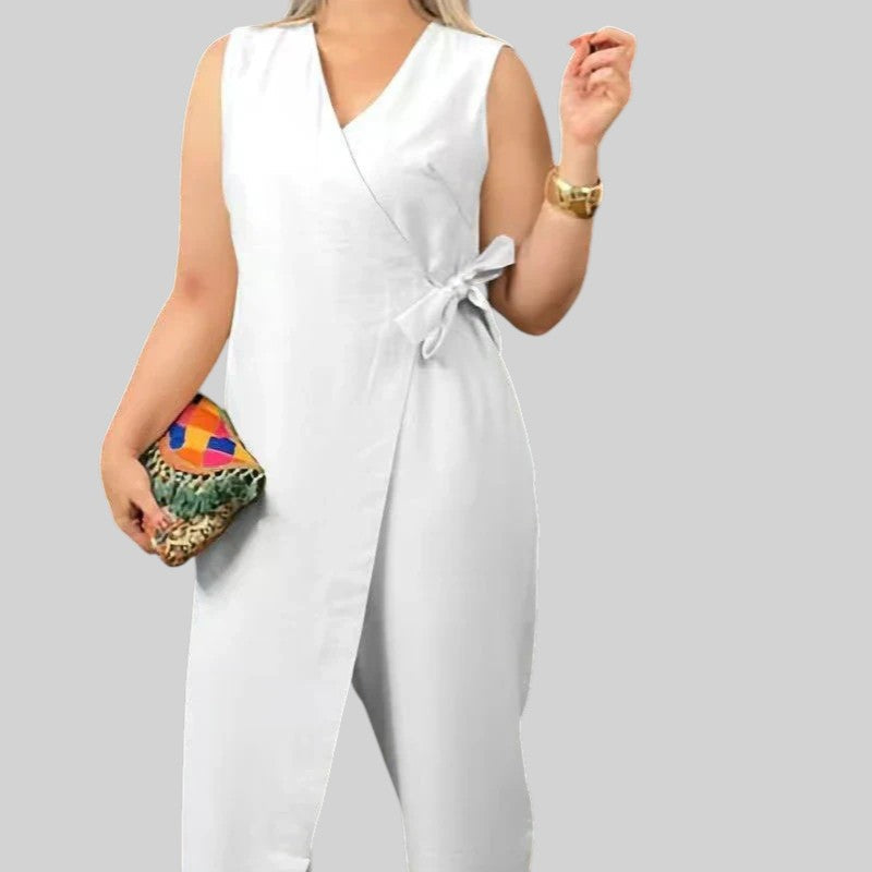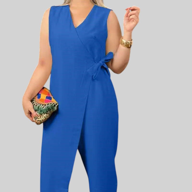 Este macacão sem mangas numa vibrante tonalidade vermelho coral traz estilo e frescura ao teu guarda-roupa. Com um design cruzado na parte superior e um laço lateral que define a cintura, cria uma silhueta favorecedora e feminina. Perfeito para eventos casuais, jantares, férias ou até mesmo uma saída de fim de semana, combina conforto com um toque sofisticado.